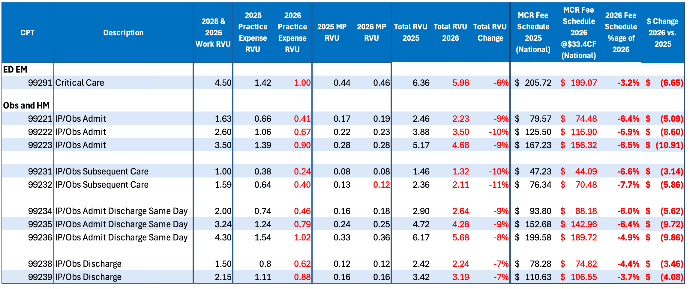 The following chart shows the specific impact to Hospital Medicine and Observation CPT codes: